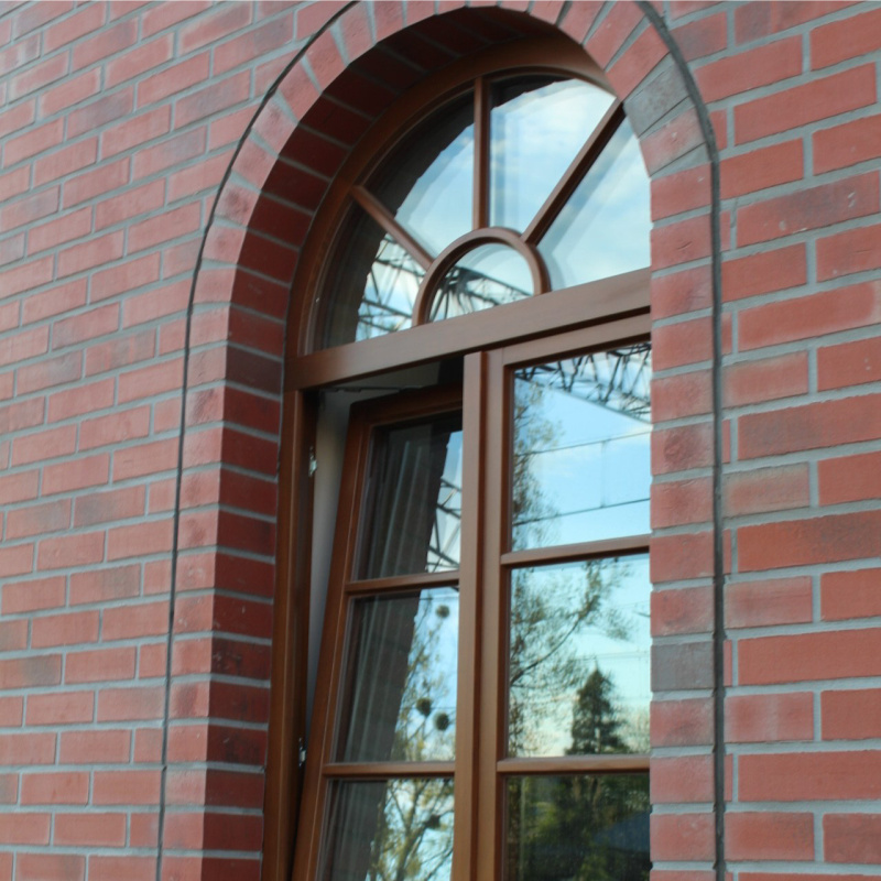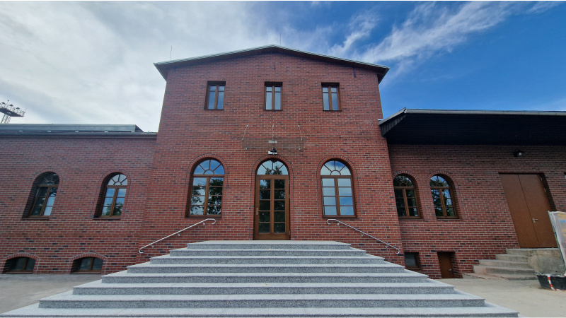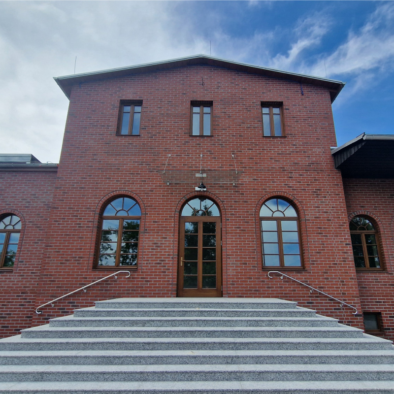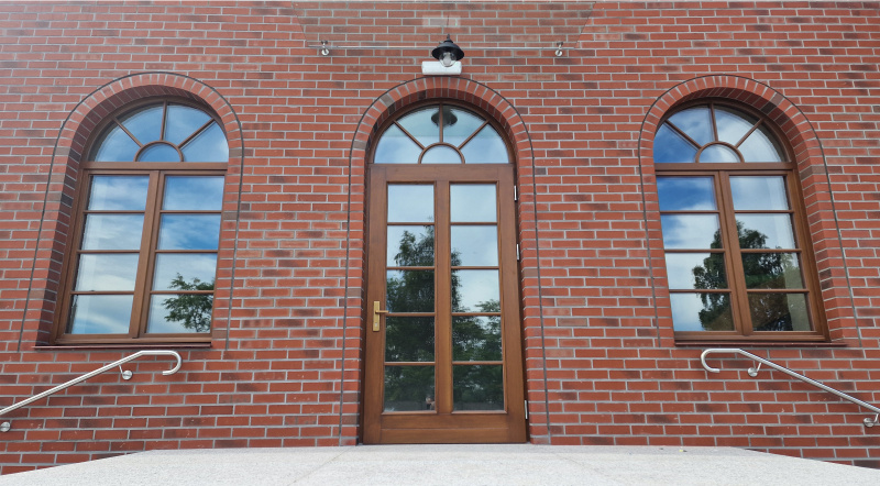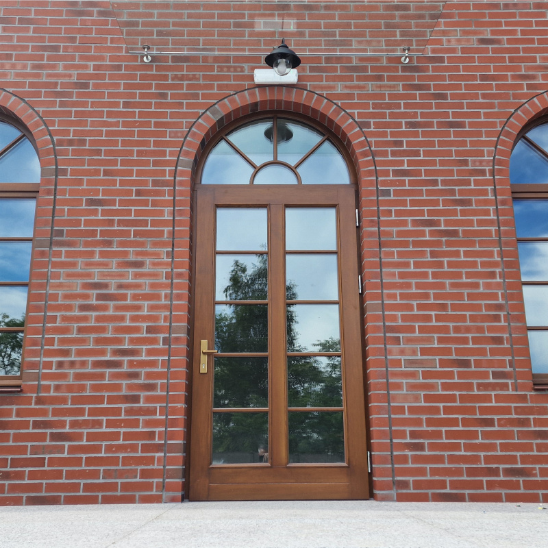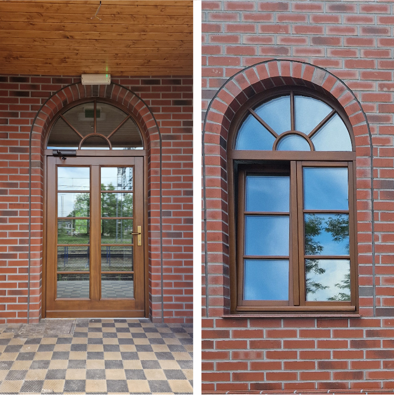 Okna i drzwi drewniane firmy Nieświec stały się częścią pięknej metamorfozy dworca kolejowego w Ozimku. Łukowe nadświetla z promienistymi szprosami wiedeńskimi doskonale komponują się z klinkierową elewacją i przywracają historyczną formę.