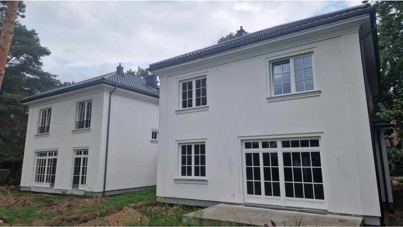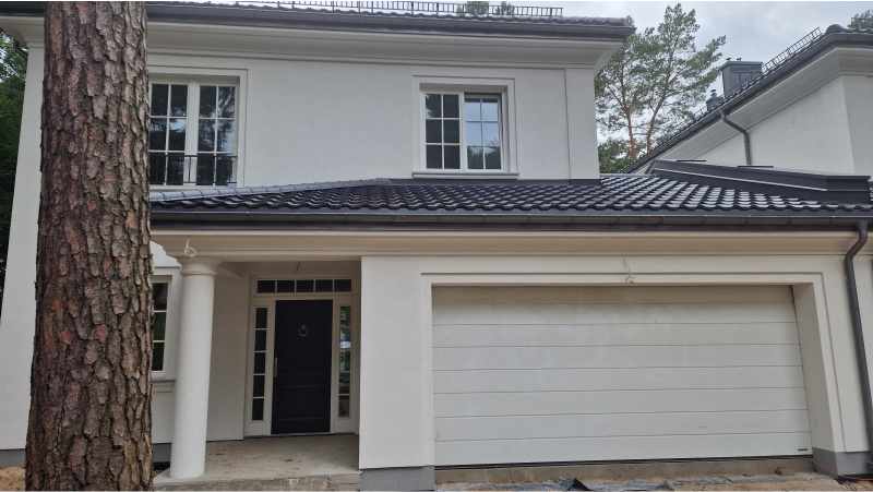 Pięknie usytuowany w sosnowym lesie w Józefowie pod Warszawą dom bliźniak. Białe okna drewniane ze szprosami oraz - dla kontrastu - antracytowe drzwi zewnętrzne. Drzwi wewnętrzne już się produkują…